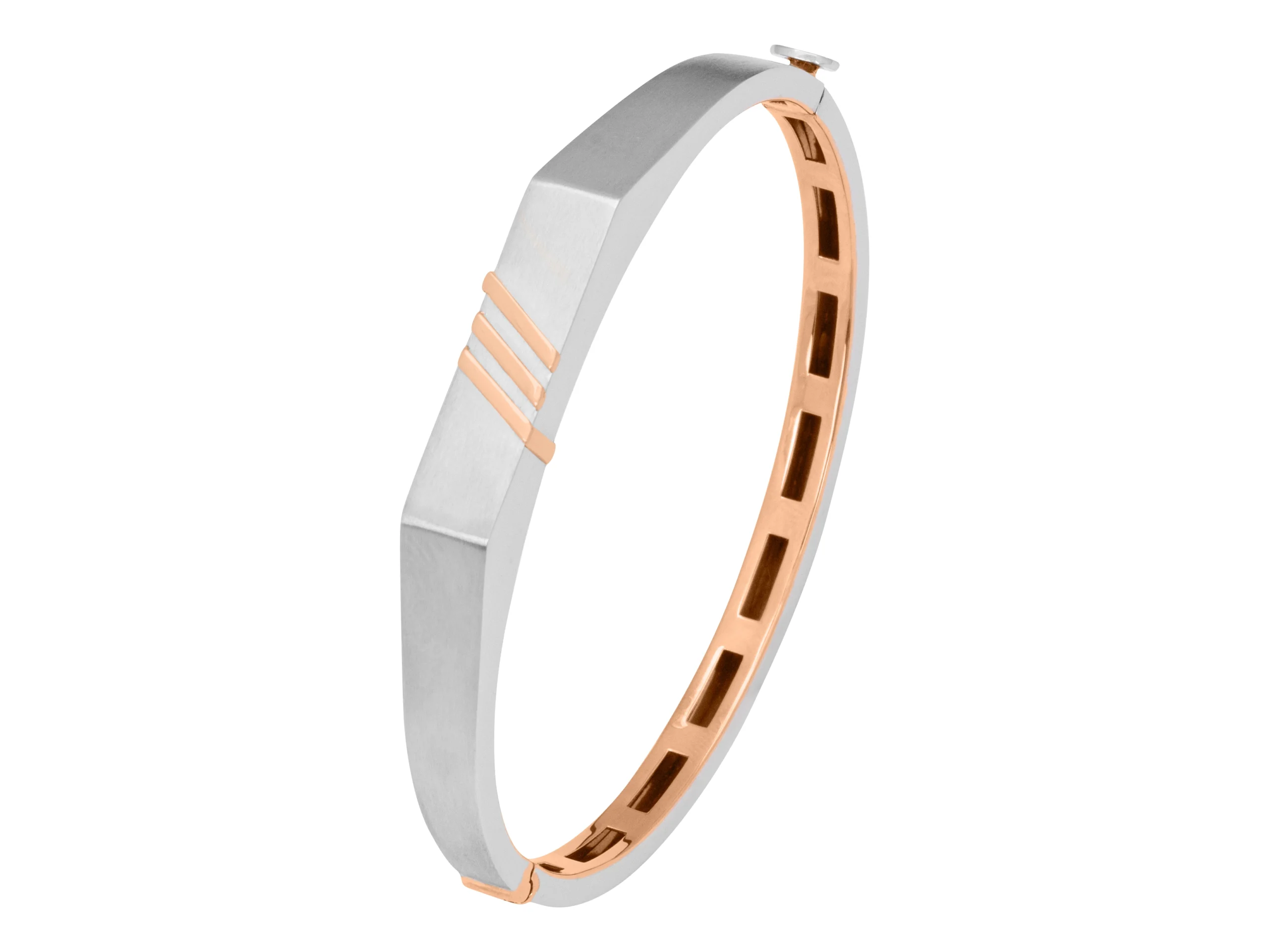 Elevate your brother’s everyday style with this sleek, dual-tone kada/men’s bracelet, crafted from a striking combination of matte-finish white and rose gold. The contemporary geometric design is accented with three parallel rose gold lines, adding a bold touch to its minimalist aesthetic. With a refined, structured build and a smooth inner lining for comfort, this piece is a perfect gift to your brother this Bhai Dooj to honor your bond with enduring elegance.