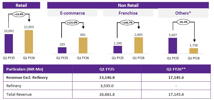 Note – The ‘Others’ Segment pertains to B2B bullion sales, particularly refinery sales, which contributed 3,535 mn in Q1 FY25 and were discontinued effective October 1, 2024. For Q1FY26, Revenue excluding the refinery segment delivered a Y-o-Y growth of 30.4%