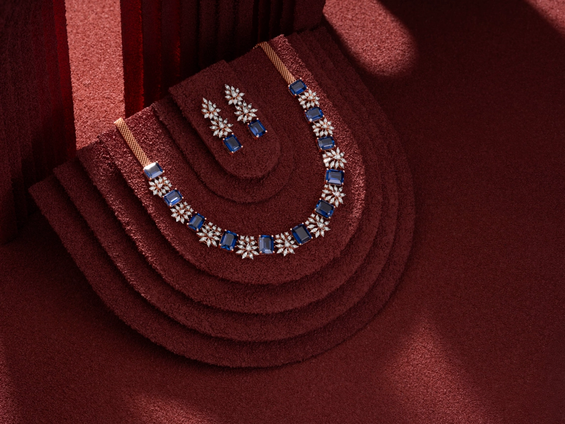 The pieces include sleek necklaces and earring sets in rose gold finishes, detailed with precision-cut stones and clean, fluid forms. Reflecting PNGS’s signature design language, the collection balances contemporary minimalism with the visual richness that has made the brand a preferred name among younger, style-conscious consumers. Key highlights include classic silhouettes with leaf and geometric patterns, statement blues that nod to the monsoon palette, and refined textures that work seamlessly from morning meetings to evening dinners.