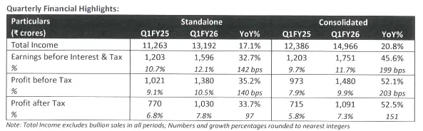 Business had an exceptional quarter recording a growth of 24% over Q1FY25 achieving a Total Income of Rs 1,273 crores EBIT came in at Rs 287 crores clocking 22.6% margin for Q1FY26.